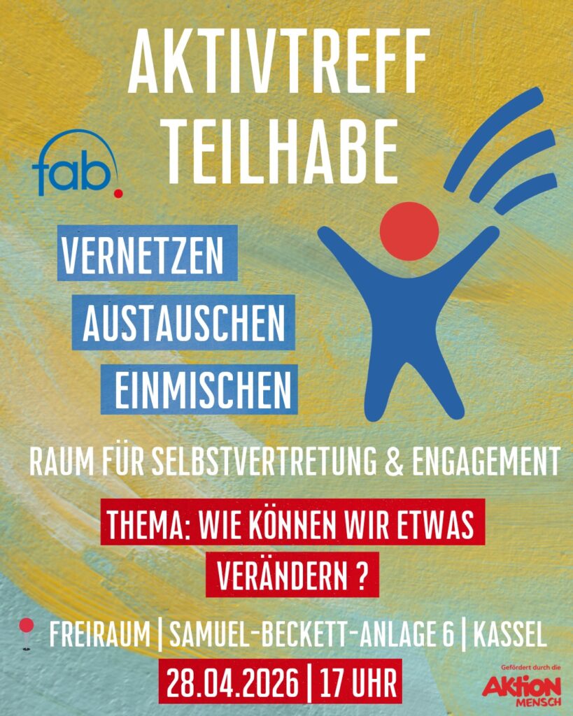 Weiterlesen: Aktivtreff Teilhabe – ein neues VernetzungsangebotIm Rahmen des Projekts „Aktiv Teilhabe gestalten“ findet künftig regelmäßig der Aktivtreff Teilhabe statt. Der erste Treff ist am 31. März.
